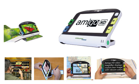 amigo HD är ett elektroniskt förstoringsglas som visar kristallklara HD-bilder på foto, olika textmaterial och på avstånd. Den har en 7 tums widescreen LCD skärm. Så lätt och enkel att använda, Justera förstoring och kontrastfärger med lätt tryckning på taktila knappar. Läs prislappar, menyer, etiketter, gatuskyltar och mer, var som helst!